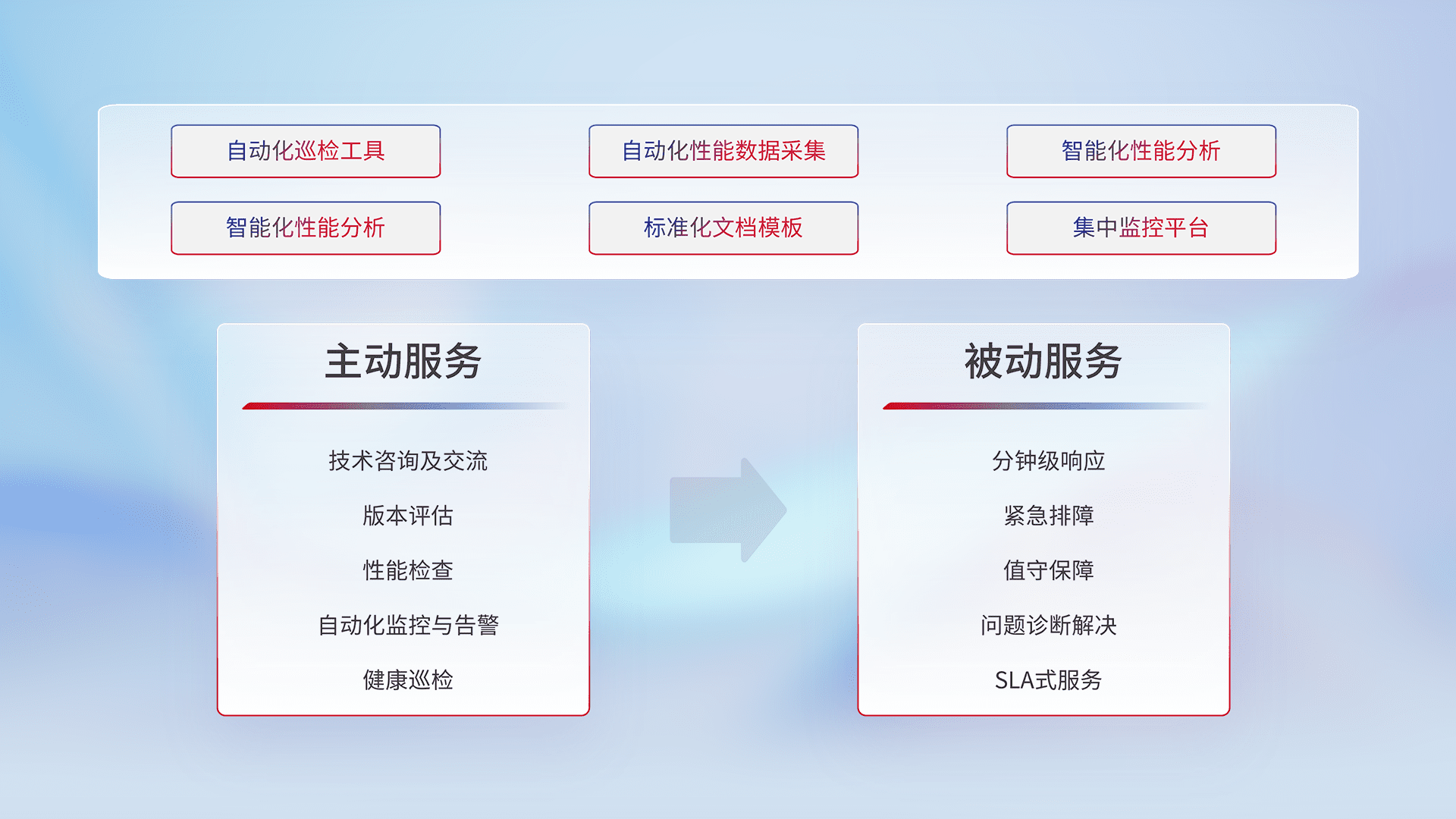 智能化工具和标准化文档,,,保障服务质量,,,,提供主动服务(包含技术咨询、、、版本评估、、、性能检查、、、、自动化监控与告警、、、健康巡检)和被动服务包含(分钟级响应、、紧急排障、、、、值守保障、、、、问题诊断解决、、、、SLA服务)。。。。
